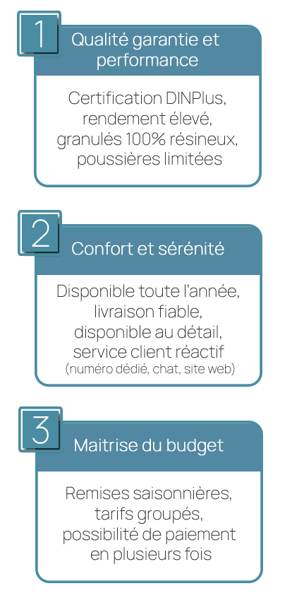Certification DINPlus, rendement élevé, granulés 100% résineux, poussières limitées.
